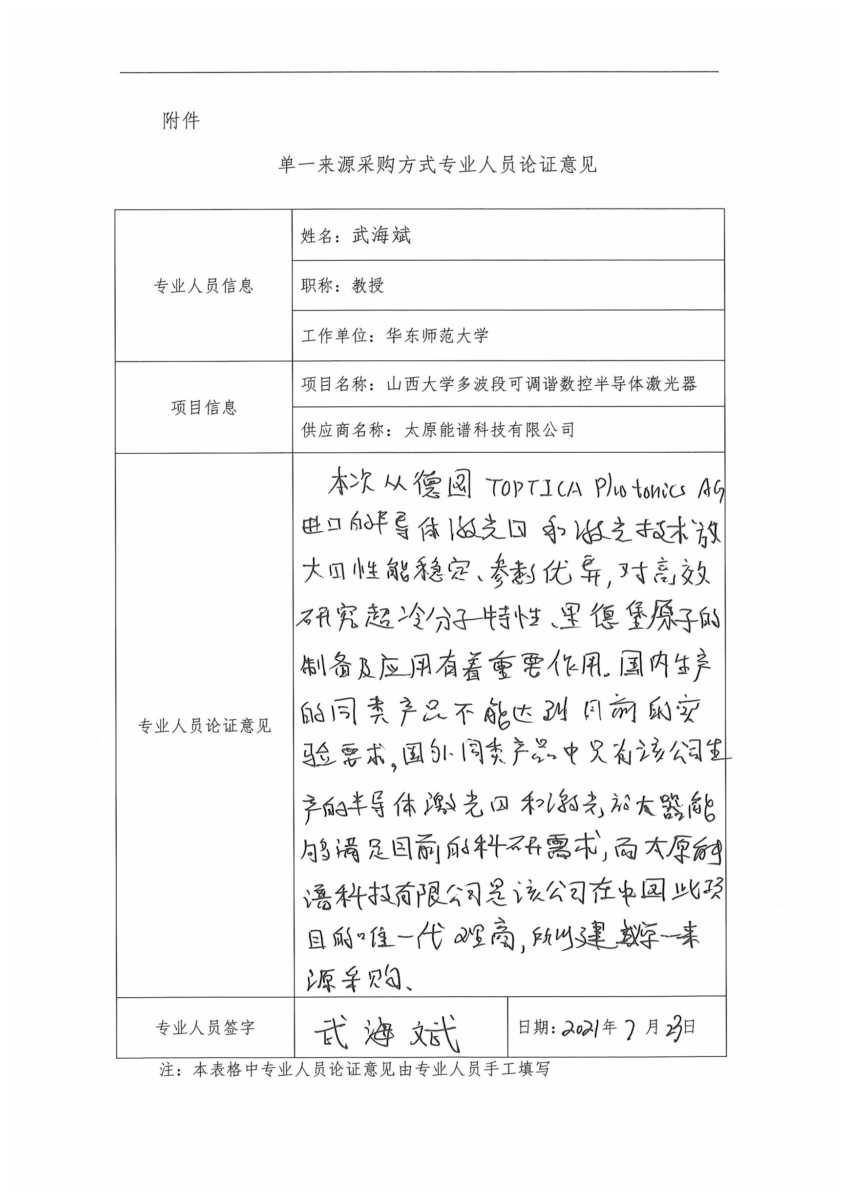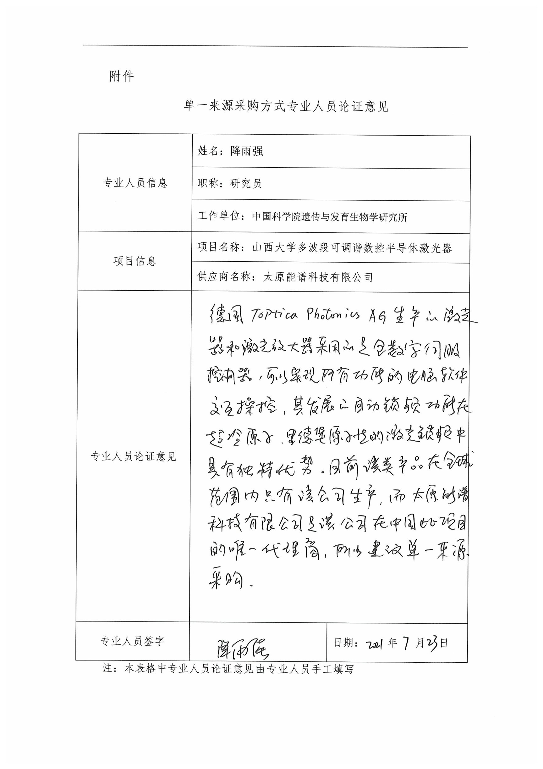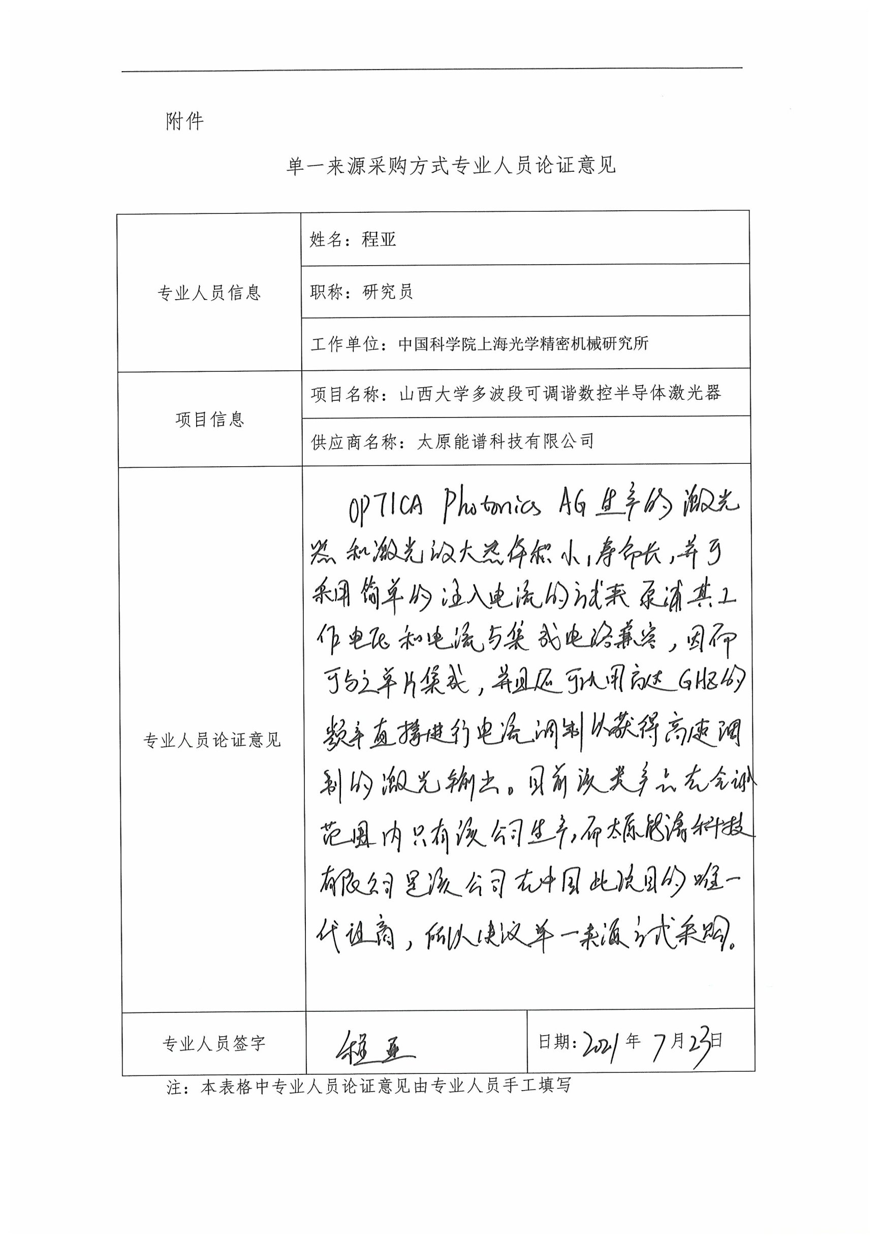 采用單一來源采購方式的原因及說明:目前,能滿足實驗技術要求的多波段可調諧數控半導體激光器只有德國TOPTICA Photonics AG生產,太原能譜科技有限公司是德國TOPTICA Photonics AG公司在中國此項目的唯一代理商,因此,申請以單一來源方式采購。